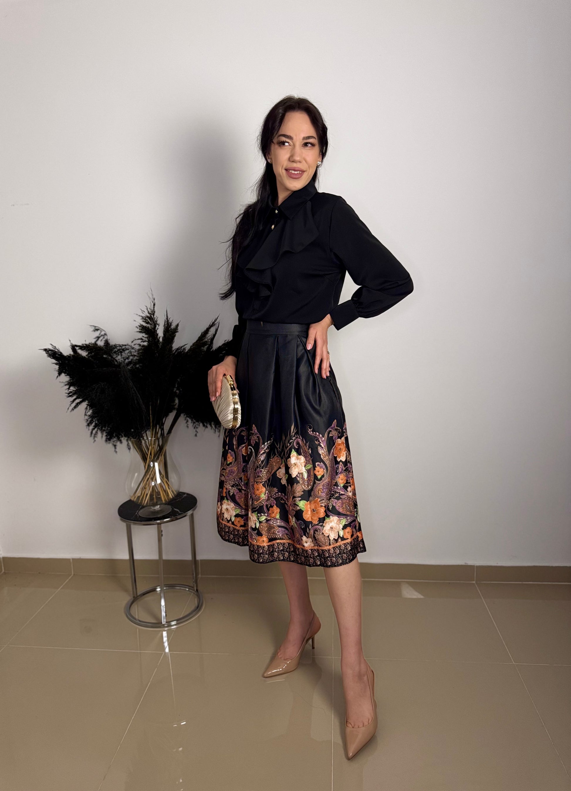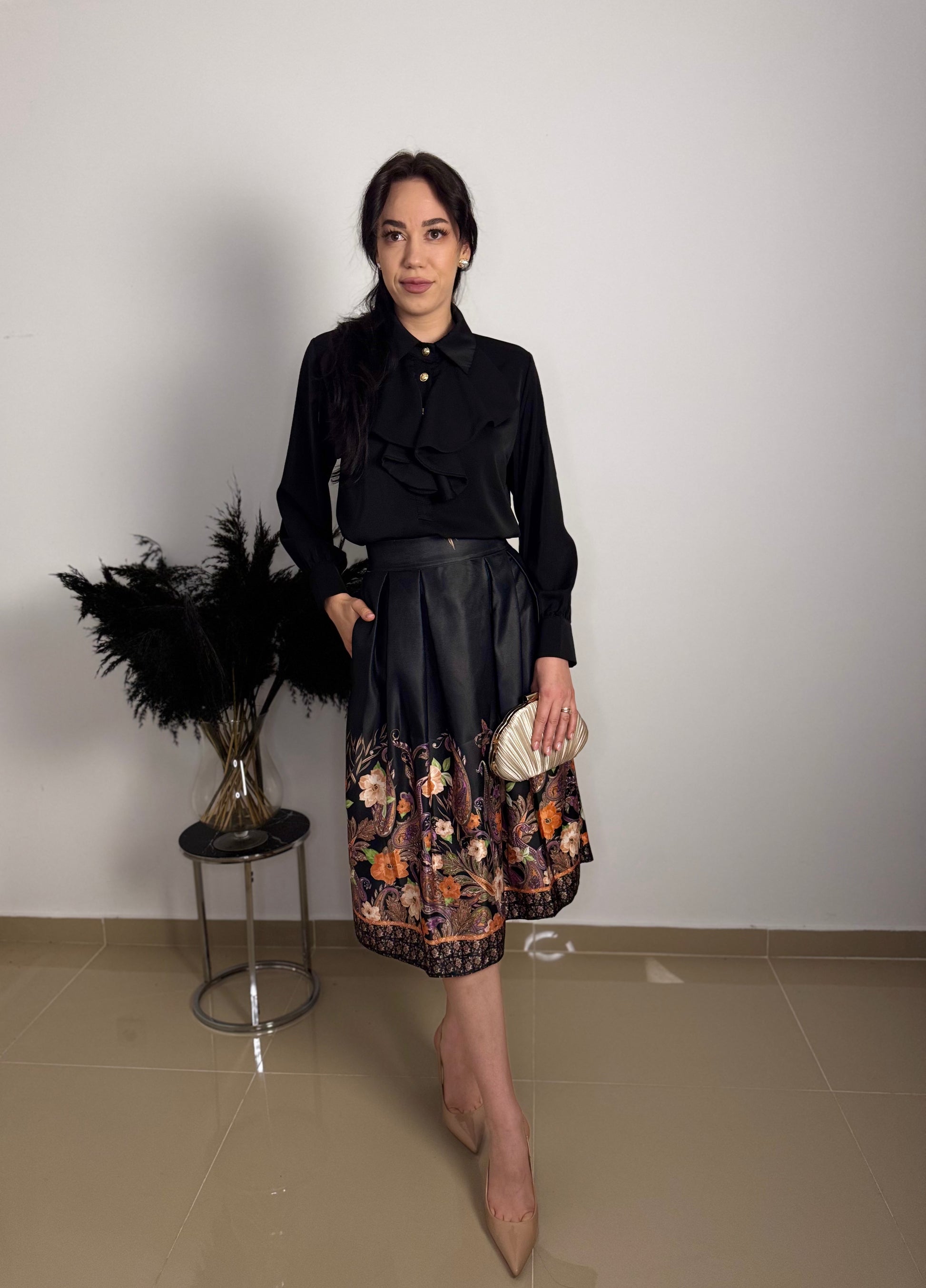 Această fustă tip cloș este alegerea perfectă pentru momentele în care vrei să te simți elegantă și încrezătoare.Fusta evidențiază delicat silueta, oferind un plus de mișcare și grație. Croiala în A și talia înaltă subliniază formele feminine, iar lungimea medie o face ideală atât pentru evenimente speciale, cât și pentru ținute de zi cu zi cu un accent sofisticat.
